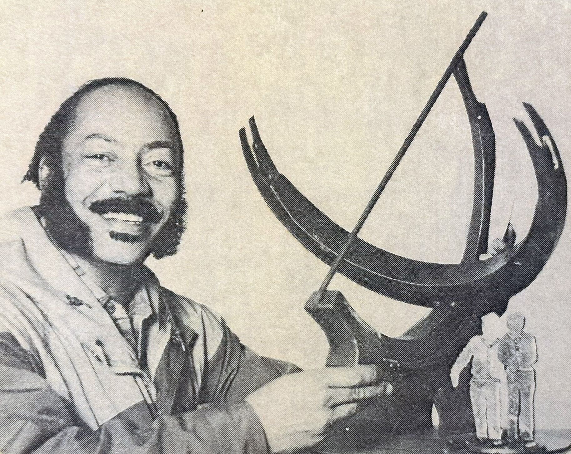 For Clark’s 50th anniversary, physics instructor Mike Pick suggested Clark build a sundial and circular plaza surrounding it. The sundial job went to welding instructor and metal sculptor Carlton Bell (pictured below), who fabricated the 14-foot anodized aluminum structure. The sundial is said to be accurate within two or three minutes throughout the year.